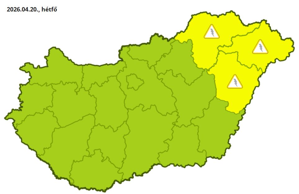 Hétfőn a késő délelőtti, déli óráktól kezdődően elsősorban az északkeleti megyékben, később alacsonyabb valószínűséggel a délnyugati határszél közelében is képződhetnek zivatarok, melyeket apró szemű jég és szélerősödés kísérhet. A Hungaromet elsőfokú figyelmeztetést adott ki hétfőre zivatarok veszélye miatt Borsod-Abaúj-Zemplén, Szabolcs-Szatmár-Bereg és Hajdú-Bihar vármegyére.