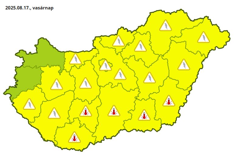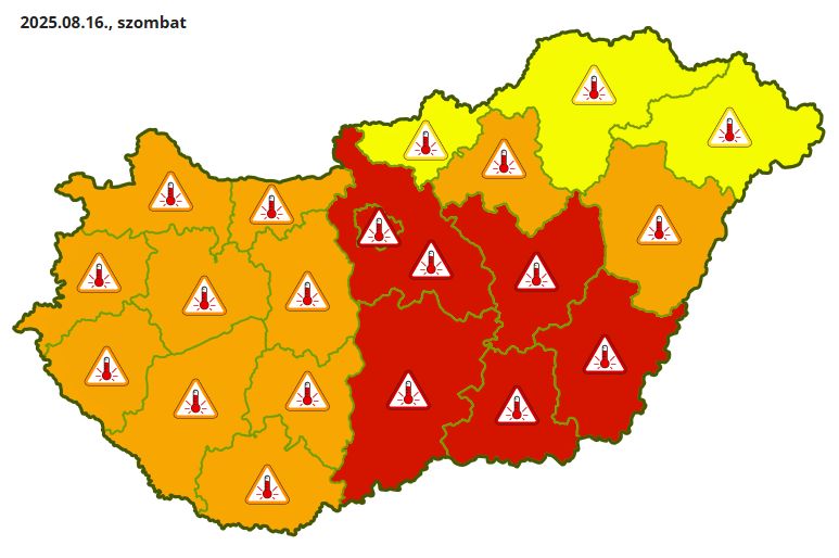 Szombaton nagy területen 27 fok felett, az ország középső és déli részein 29 fok felett alakul a napi középhőmérséklet. Szombaton Nógrád, Borsod-Abaúj-Zemplén és Szabolcs-Szatmár-Bereg vármegyében elsőfokú, Győr-Moson-Sopron, Vas, Zala, Komárom-Esztergom, Fejér, Tolna, Baranya, Veszprém, Somogy, Heves és Hajdú-Bihar vármegyében másodfokú, Pest, Bács-Kiskun, Békés, Jász-Nagykun-Szolnok és Csongrád-Csanád vármegyében pedig harmadfokú figyelmeztetést adott ki a Hungaromet a magas középhőmérséklet miatt.
