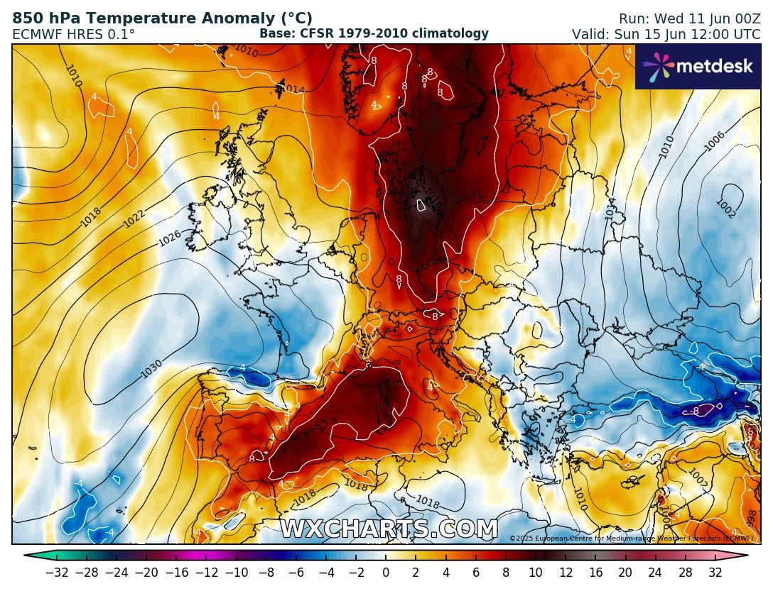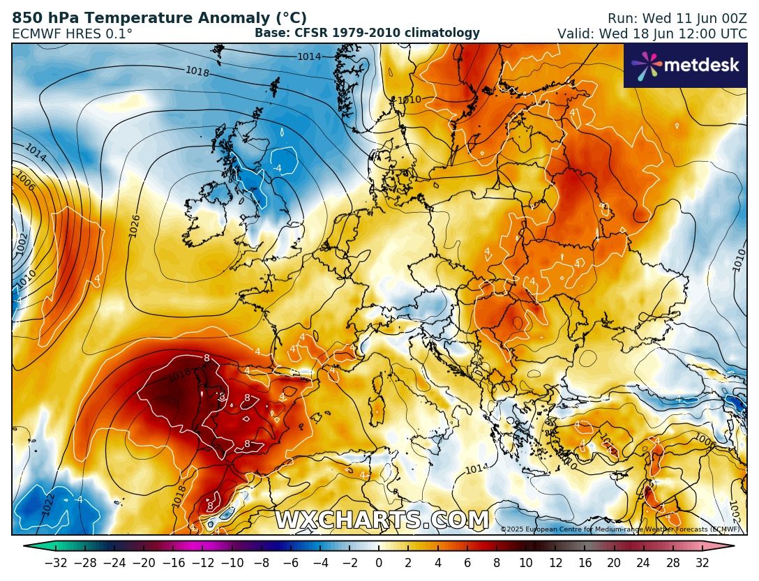 A múlt heti hőhullámot követően a hőmérséklet a június közepén szokásos szintre esett vissza térségünkben. Nyugat-Európa felett ugyanakkor egy újabb hőhullám alakult ki, amely a következő napokban közelít a Kárpát-medence felé, de várhatóan nálunk nem okozó erős kánikulát.
