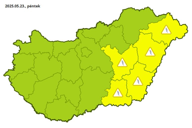 A HungaroMet elsőfokú figyelmeztetést adott ki péntekre a zivatarok miatt Szabolcs-Szatmár-Bereg, Hajdú-Bihar, Jász-Nagykun-Szolnok, Csongrád-Csanád és Békés vármegyére.