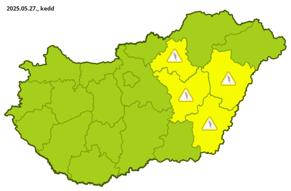 Kedden délután a Salgótarján-Békéscsaba vonal térségében, illetve keleten helyenként zivatarok kialakulhatnak. A HungaroMet elsőfokú figyelmeztetést adott ki keddre a zivatarok veszélyes kísérőjelenégei miatt Heves, Hajdú-Bihar, Békés és Jász-Nagykun-Szolnok vármegyére. Az aktuális, legfrissebb információkat megtalálhatják veszélyjelzés oldalunkon.