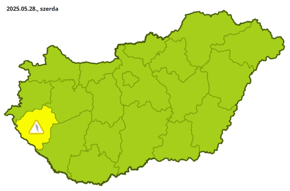 Szerdán estétől délnyugaton, nyugaton néhol zivatar előfordulhat, emiatt Zala vármegyében elsőfokú figyelmeztetés érvényes.