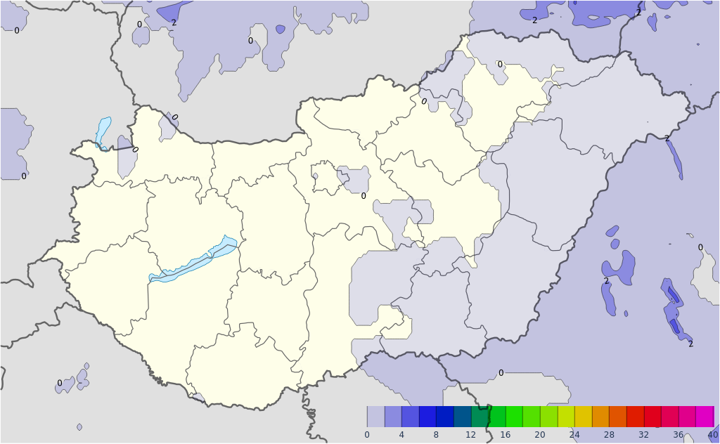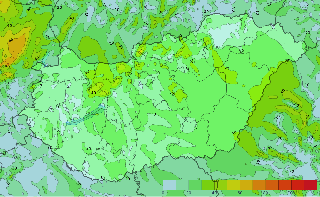 Hétfőn a délutáni óráktól az éjszakába nyúlóan az északnyugatról-délkelet felé vonuló záporok mellett van esély zivatar előfordulására is – az Észak-Dunántúlon és a főváros tágabb térségében, valamint az északkeleti megyékben. Az intenzívebb záporos cellákat átmenetileg viharos (~60-70 km/h) széllökések kísérhetik.