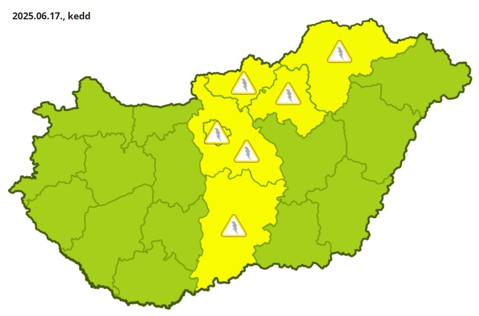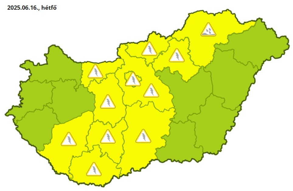 A Hungaromet elsőfokú figyelmeztetést adott ki zivatarok veszélye miatt hétfőre Somogy, Tolna, Baranya, Komárom-Esztergom, Fejér, Pest, Bács-Kiskun, Nógrád, Heves és Borsod-Abaúj-Zemplén vármegyére. Utóbbi területen pedig felhőszakadás kialakulása miatt szintén elsőfokú figyelmeztetés érvényes.