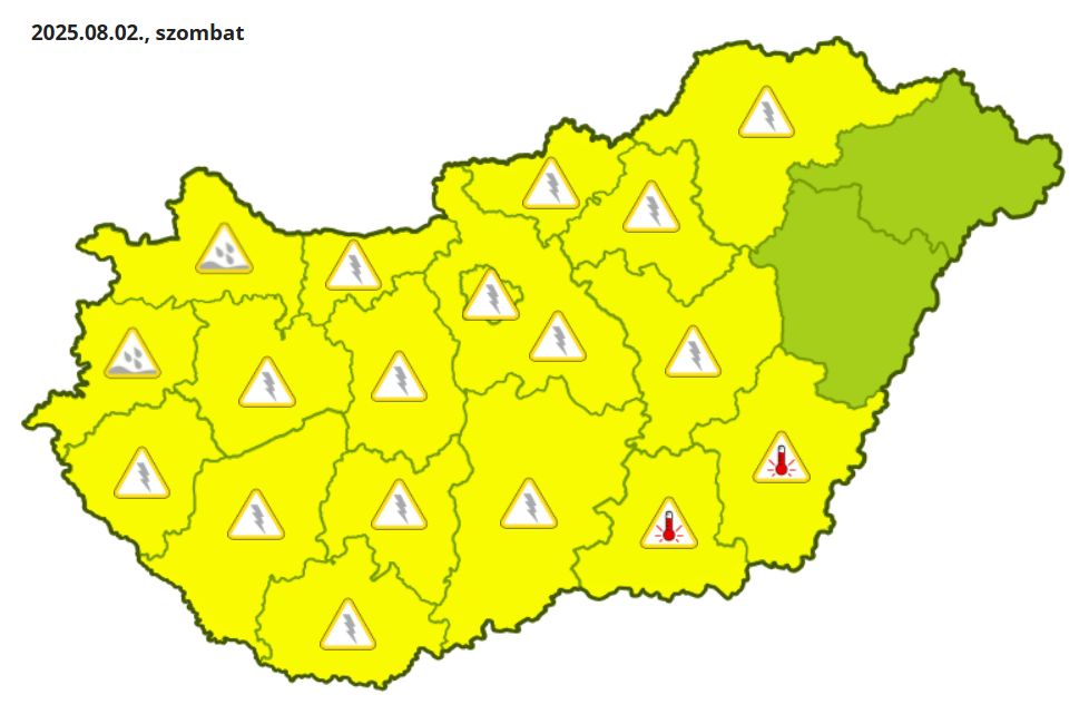 Szombat hajnalban északnyugaton a záporok mellett egy-egy zivatar előfordulhat, majd késő délutántól nyugat felől egyre többfelé kell számítani zivatarokra, melyek a Dunántúlon akár rendszerbe is szerveződhetnek, és köztük heves zivatar is előfordulhat. A zivatarokat általában intenzív csapadék (15-25 mm), viharos szél (65-75 km/h), apróbb szemű jég (~ 1-2 cm) kísérheti. Az ország nyugati, északnyugati harmadában egy-egy heves zivatar is kialakulhat felhőszakadás (> 25-30 mm), erősen viharos szél (> 80-90 km/h) és nagy méretű jég (> 2-3 cm) kíséretében. Zivatarok veszélye miatt négy tiszántúli vármegye kivételével az egész országban elsőfokú figyelmeztetés érvényes szombaton. Felhőszakadás kialakulása miatt Győr-Moson-Sopron és Vas vármegyében elsőfokú figyelmeztetés érvényes.