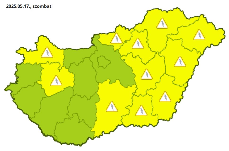 A HungaroMet elsőfokú figyelmeztetést adott ki szombatra a zivatarok és azok veszélyes kísérőjelenségei miatt Győr-Moson-Sopron, Veszprém, Bács-Kiskun, Csongrád-Csanád, Békés, Jász-Nagykun-Szolnok, Nógrád, Heves, Hajdú-Bihar, Szabolcs-Szatmár-Bereg és Borsod-Abaúj-Zemplén vármegyére.