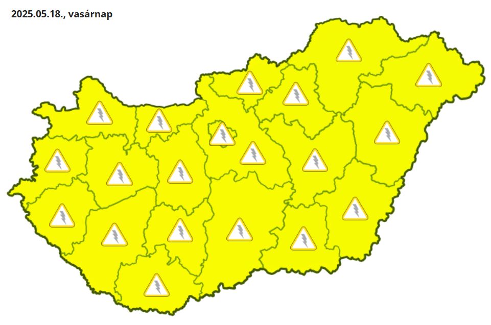 Vasárnap napközben a szombatihoz képest már nagyobb valószínűséggel és számban alakulhatnak ki zivatarok, amelyekhez intenzív csapadék (~15-25 mm), jégeső (~1 cm), illetve viharos (>60-80 km/h) széllökések is társulhatnak. Főként a déli országrészben egy-egy hevesebb zivatar előfordulása sem kizárt (jég: ~2 cm; széllökés: ~90 km/h). Vasárnap országszerte elsőfokú figyelmeztetés érvényes a zivatarok veszélyes kísérőjelenségei miatt.