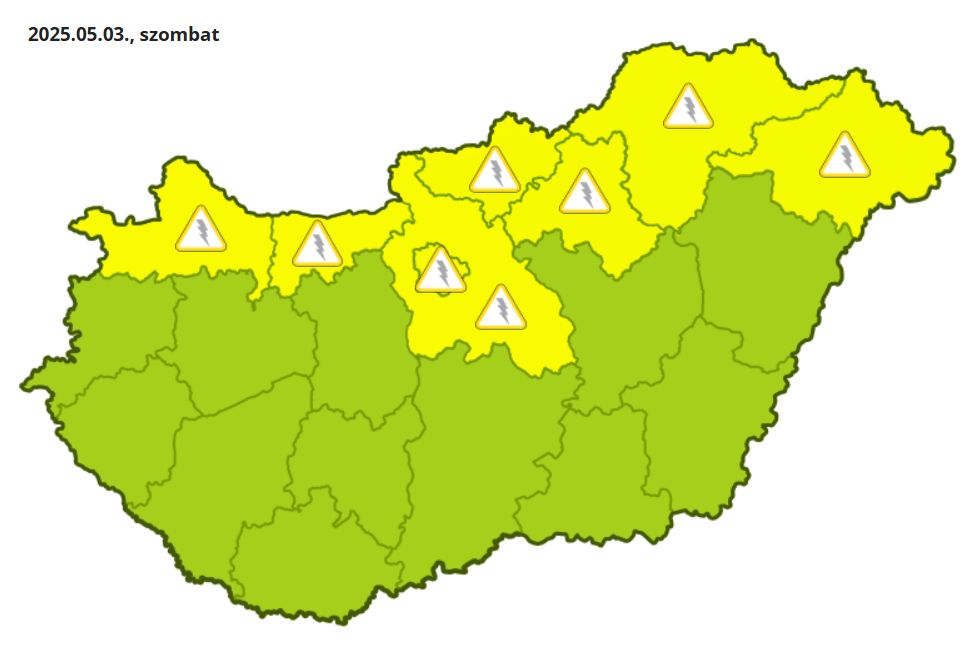 Zivatar veszélye miatt Győr-Moson-Sopron, Komárom-Esztergom, Pest, Nógrád, Heves, Borsod-Abaúj-Zemplén és Szabolcs-Szatmár-Bereg vármegyében elsőfokú figyelmeztetés érvényes szombaton.