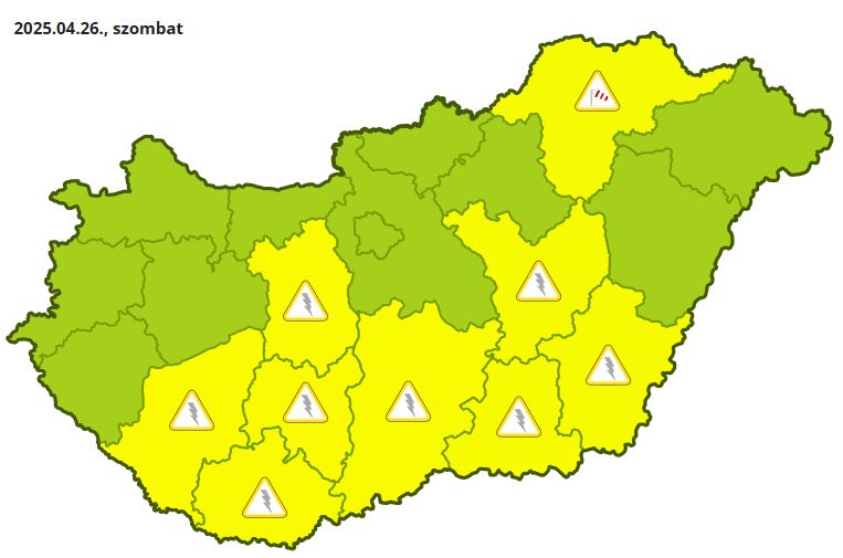 2025. április. 26 8:41A déli vármegyékben szombaton napközben néhol még előfordulhat gyenge zivatar. Északkeleten a legerősebb széllökések elérhetik a 70 km/órát.